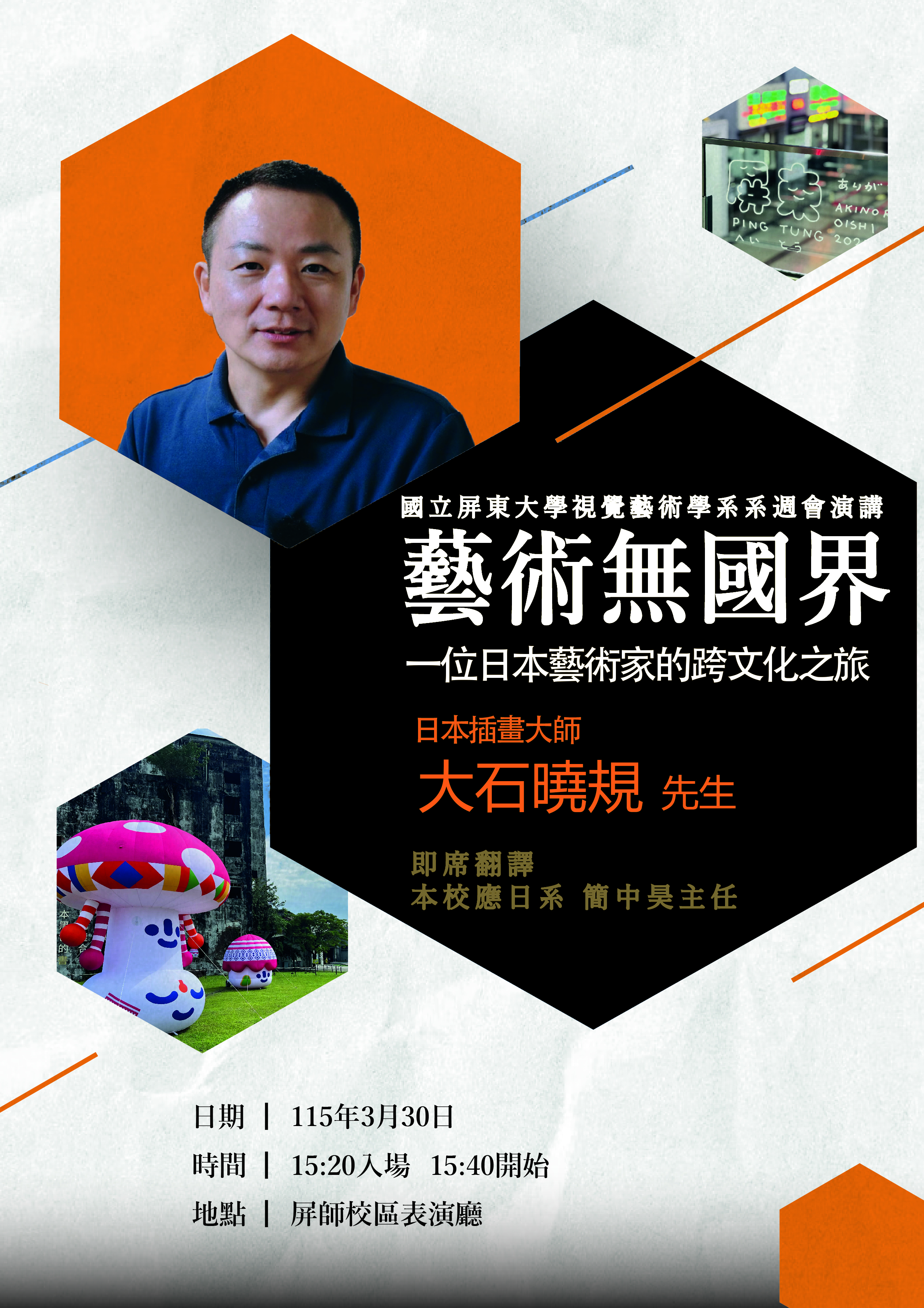 藝術創作不應受限於疆界,這一次,我們邀請你一起跳脫框架! 3月30日的系週會將以「藝術無國界」為題,分享日本插畫大師大石曉規先生的藝術趨勢與實務經驗,讓你在屏東也能接軌世界。歡迎全校師生參與。